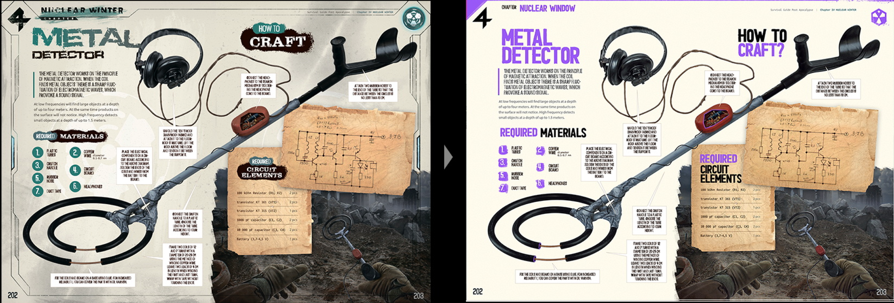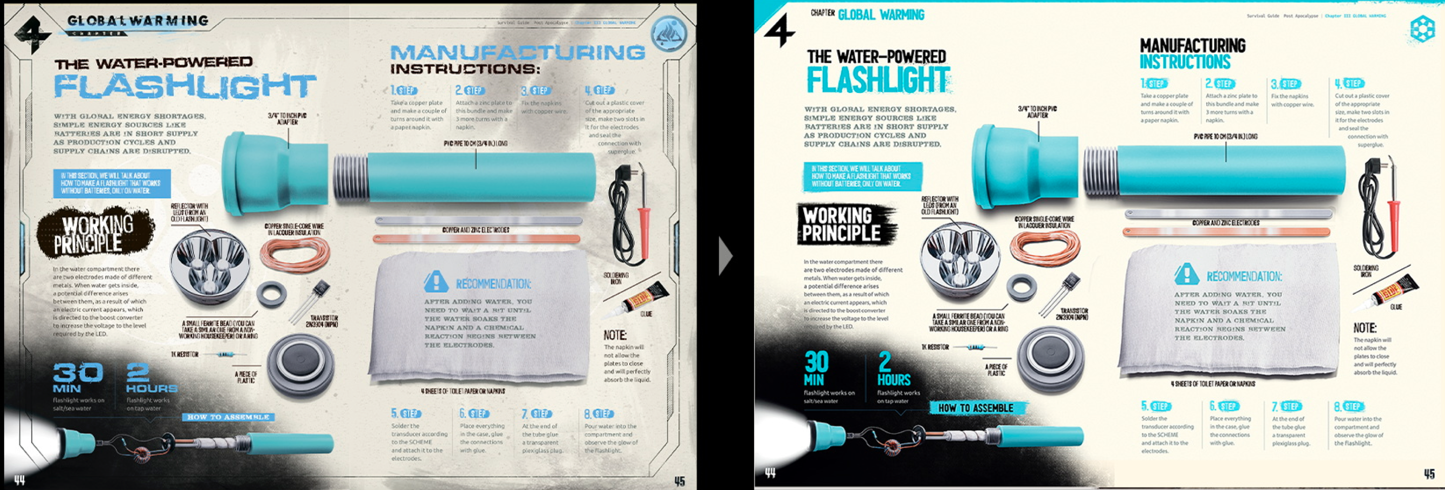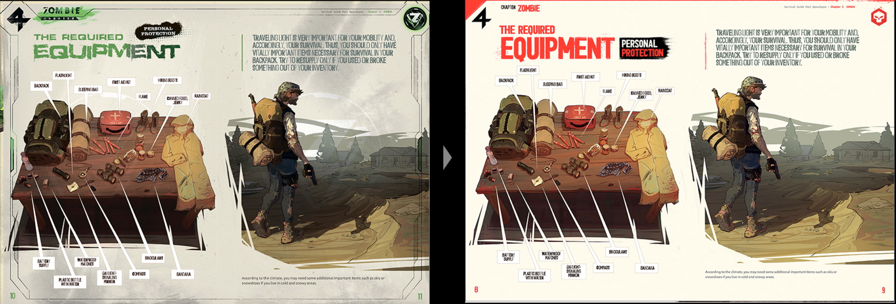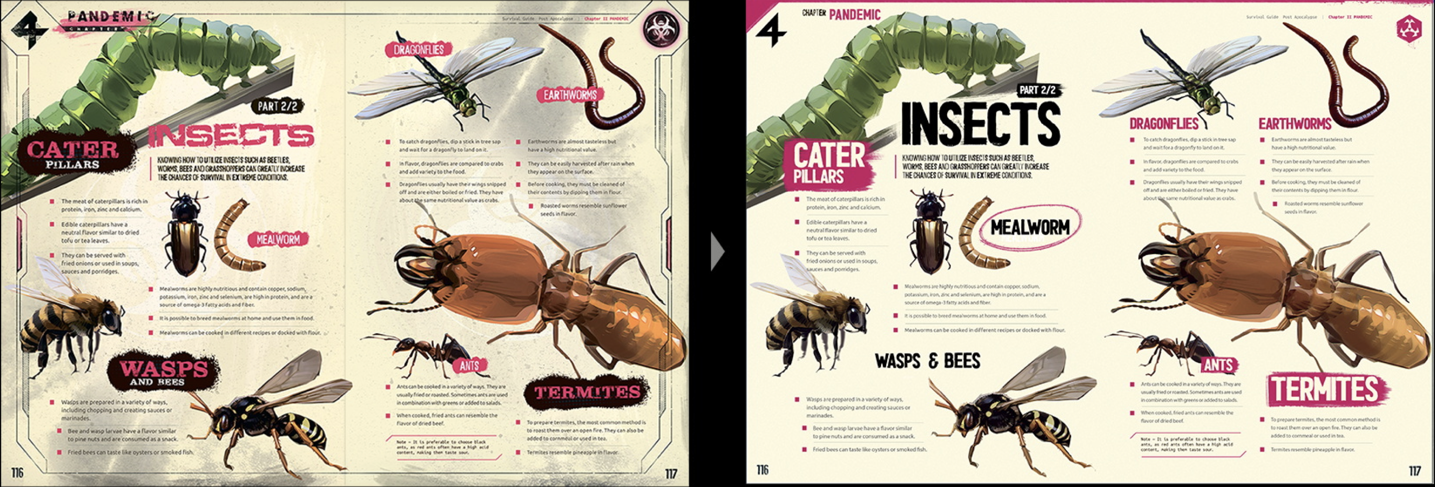 You can see the difference here—these are the first and final versions of the spreads for the Pandemic, Zombie, Nuclear Winter, and Global Warming chapters: